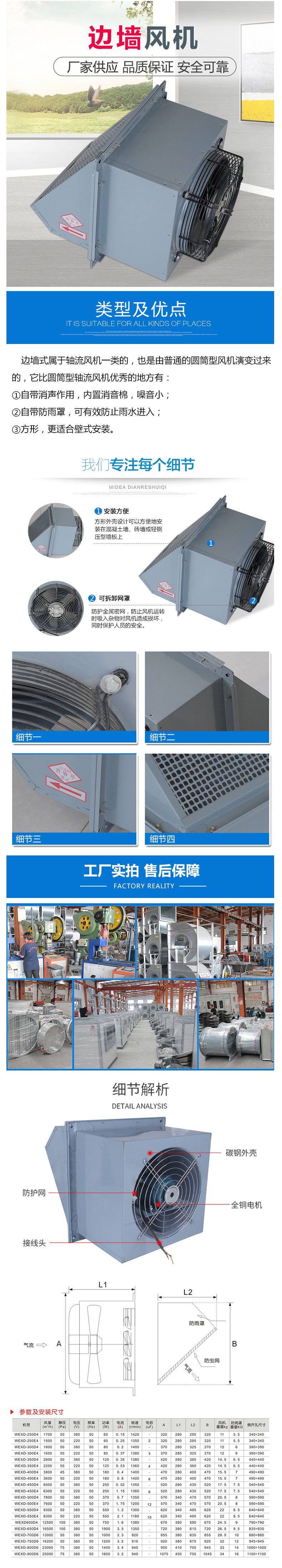 邊牆風機采用先進的前掠型葉片、低噪音的外轉子或內轉(zhuǎn)子風機專用電機直聯傳動,方形外殼設計可以方便(biàn)地安裝在混凝土牆、磚牆或輕鋼壓型牆板上,方形防雨罩結構牢固,外(wài)形美觀。