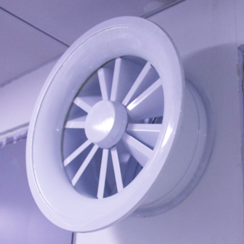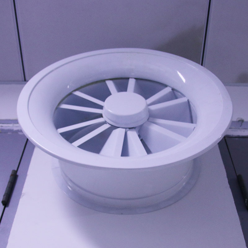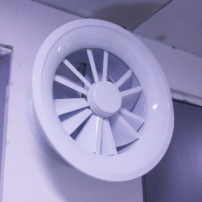 旋流風(fēng)口是空調係統中的(de)一個送風工具。在(zài)空調通風係統中可用作大風量,大溫差送風以減少風口(kǒu)數量,安裝在天(tiān)花(huā)板或頂棚(péng)上,可用於3米以內低空間,也可用二種高度大麵積送風。