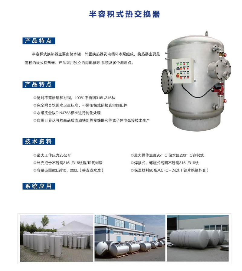 半容(róng)積(jī)式換熱器主要由儲水罐、外置換熱器及內循環水泵組成(chéng),換(huàn)熱器主(zhǔ)要是高效的(de)板式換熱(rè)器,產(chǎn)品采用獨(dú)立的內部循環係(xì)統及多(duō)個測溫(wēn)點。